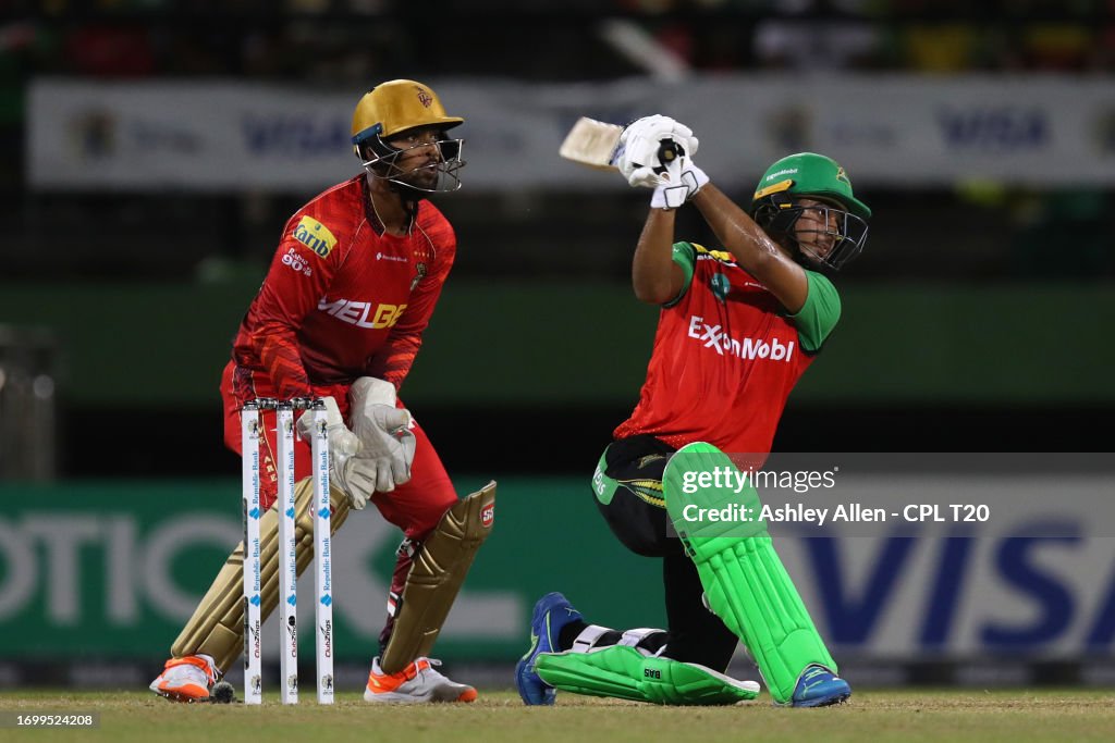 Saim Ayub of Guyana Amazon Warriors hits four runs during the Republic Bank Caribbean Premier League Final between Trinbago Knight Riders and Guyana Amazon Warriors at Providence Stadium on September 24, 2023 in Guyana. (Photo by Ashley Allen – CPL T20/CPL T20 via Getty Images)