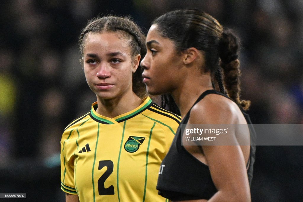 Jamaica’s defender #19 Tiernny Wiltshire reacts at the end of the Australia and New Zealand 2023 Women’s World Cup round of 16 football match between Jamaica and Colombia at Melbourne Rectangular Stadium, also known as AAMI Park, in Melbourne on August 8, 2023. (Photo by WILLIAM WEST/AFP via Getty Images)Jamaica’s midfielder #02 Solai Washington (L) cries at the end of the Australia and New Zealand 2023 Women’s World Cup round of 16 football match between Jamaica and Colombia at Melbourne Rectangular Stadium, also known as AAMI Park, in Melbourne on August 8, 2023. (Photo by WILLIAM WEST/AFP via Getty Images)