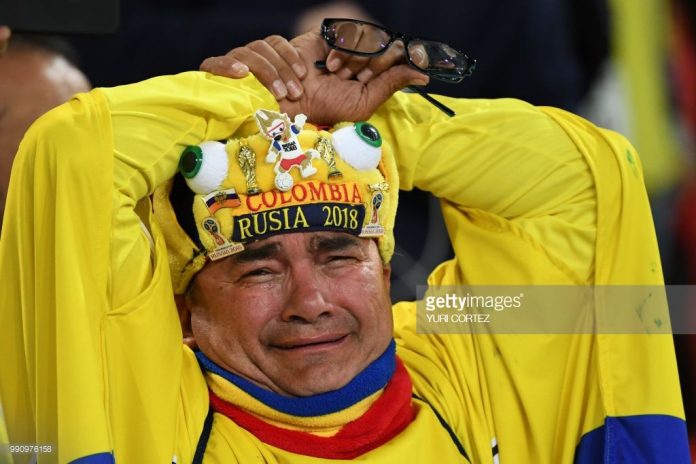 News Americas, NEW YORK, NY, Weds. July 4, 2018: Colombian fans gathered in large numbers at the Spartak Stadium in Moscow on July 3, 2018 cried openly Tuesday as their team lost to England on penalty kicks in the final match of the round of 16. Colombia, despite fighting for a win, failed to score two of their penalty kicks, resulting in their loss to the English side and their fans shocked and heartbroken. Here are the raw emotional reactions from fans and players.