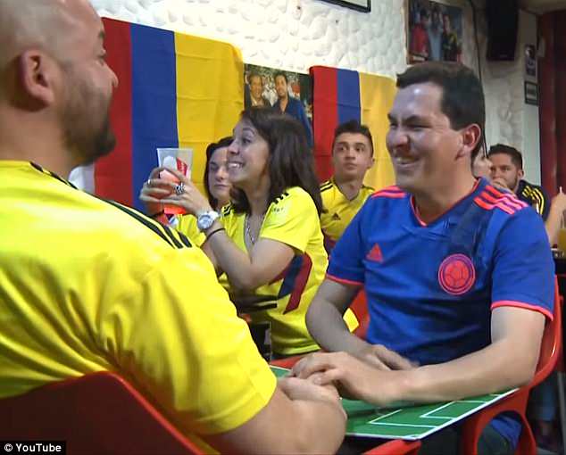 As the Columbia-Poland Group H match in Kazan, Russia played on a large screen TV, Daza deftly translated the movements on the field to a miniature football field-shaped board where he held hands with Gallego.