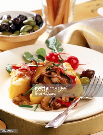 Polenta, (Italian pronunciation: [po’lenta]), is a dish of boiled cornmeal in Italian, French, and Swiss cuisine. It may be consumed hot as a a porridge or allowed to cool and solidify into a loaf, which is then baked, fried, or grilled.