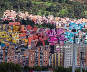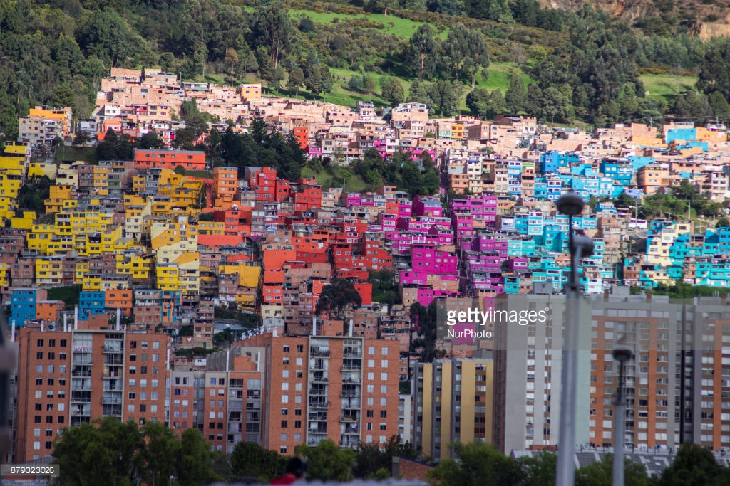 A panoramic view of the macro mural inaugurated today by the mayor of Bogotá, Enrique Penalosa, Habitarte project in Bogotá, Colombia, November 25, 2017. Habitarte is a project of the Secretariat of Habitat, which aims to legalize neighborhoods and intervene 65,000 facades throughout the city. According to the Secretary of Habitat, at the end of the year more than 39,000 facades will be intervened in this important area of the city. (Photo by Daniel Garzon Herazo/NurPhoto via Getty Images)