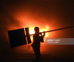 Supporters of Honduran presidential candidate for the Opposition Alliance against the Dictatorship party Salvador Nasralla, set a barricade alight during a protest outside the Electoral Supreme Court (TSE), to demand the announcement of the election final results in Tegucigalpa, on November 30, 2017. Honduran opposition candidate Salvador Nasralla said he would not recognize the results to be announced by the Supreme Electoral Tribunal, after accusing it of tampering with the vote count to favor the reelection of President Juan Orlando. (Photo credit: ORLANDO SIERRA/AFP/Getty Images)