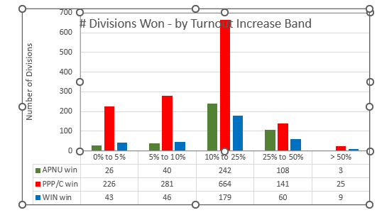 The effects were uneven. In the 680 divisions where turnout increased, the PPP/C captured 77% of them. WIN picked up 13% and the APNU, just 10%.