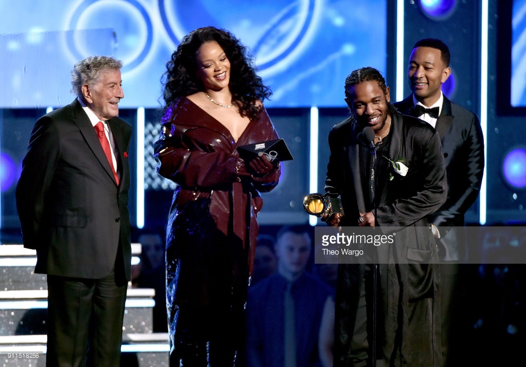 2: Bajan-born recording artists Rihanna, (center l), and Kendrick Lamar (center r) won and accepted the Grammy for the Best Rap/Sung Performance award for ‘Loyalty’ from recording artists Tony Bennett (L) and John Legend (R) onstage.