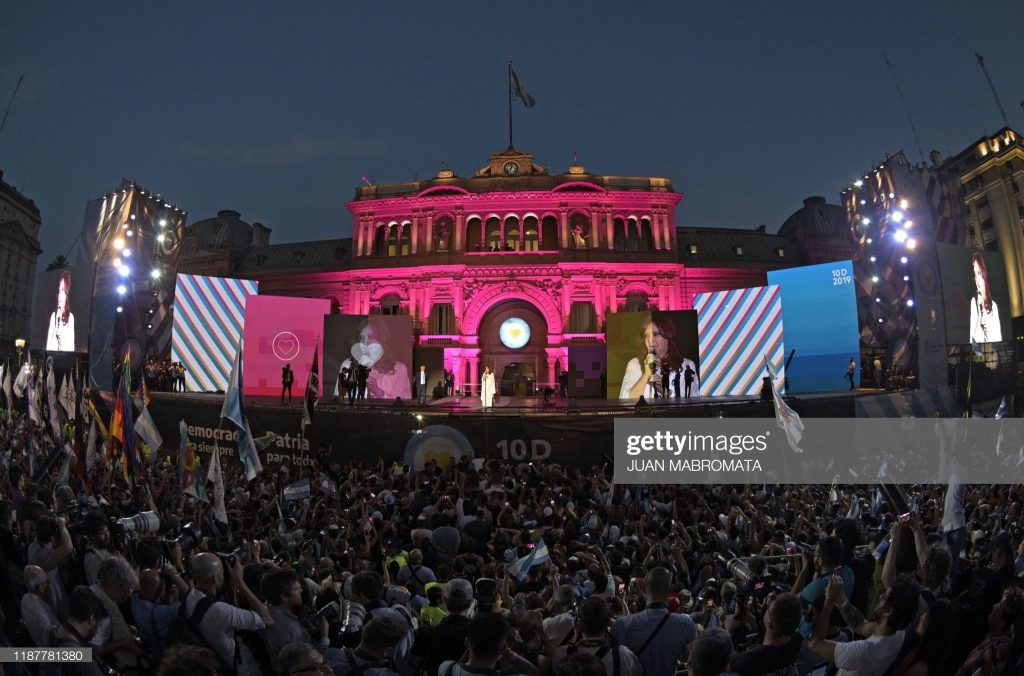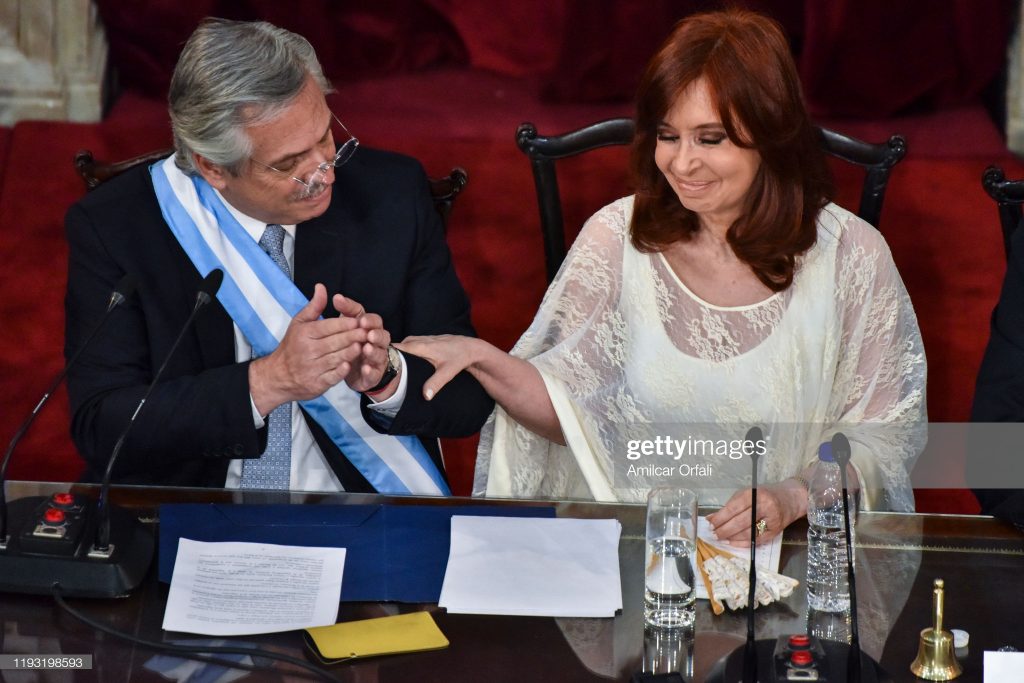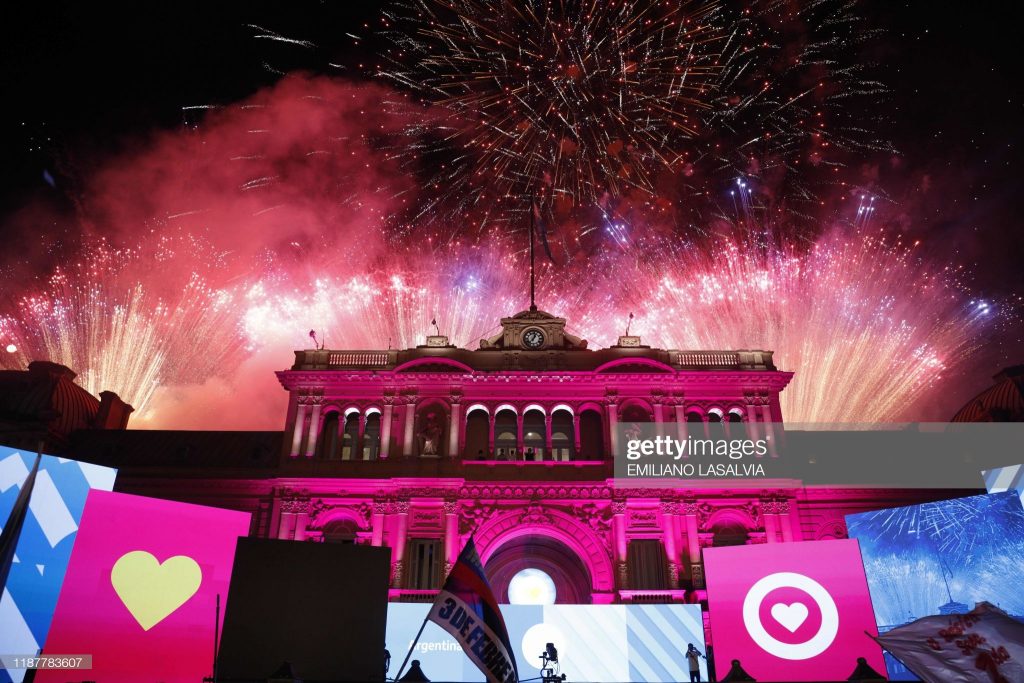 View of the Plaza de Mayo square, during the inauguration of Argentina’s President Alberto Fernandez and his Vice-President Cristina Fernandez de Kirchner, in Buenos Aires, on December 10, 2019. (Photo by JUAN MABROMATA/AFP via Getty Images)View of fireworks over the Casa Rosada presidential palace and Plaza de Mayo square, during the inauguration of Argentina’s President Alberto Fernandez and his Vice-President Cristina Fernandez de Kirchner, in Buenos Aires, on December 10, 2019. (Photo by EMILIANO LASALVIA/AFP via Getty Images) President of Argentina Alberto Fernandez (L) delivers his opening speech after being sworn into office during the Presidential Inauguration Ceremony at National Congress on December 10, 2019 in Buenos Aires, Argentina. (Photo by Amilcar Orfali/Getty Images)Former President Carlos Menem and Zulemita Menem during the Presidential Inauguration Ceremony at National Congress on December 10, 2019 in Buenos Aires, Argentina. (Photo by Amilcar Orfali/Getty Images)Argentina’s new Vice-President Cristina Fernandez de Kirchner (C, and on screens) speaks outside the Casa Rosada presidential palace in front of crowds at Plaza de Mayo square, during her and Argentine new President Alberto Fernandez’s inauguration, in Buenos Aires, on December 10, 2019. (Photo by JUAN MABROMATA/AFP via Getty Images)