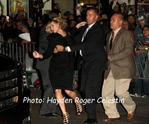 After her taping, she exited the Ed Sullivan Theater, and went over to her fans to sign autographs and posed for pictures with them. With about 200 fans screaming and pushing for their opportunity to get their autograph or picture with the ‘Hunger Games’ leading lady, it probably got to much for her as fans pushed through the barrier. Although her security detail tried to calm her, she got scared and tried to get back to her truck as quick as possible, to get out of their reach.