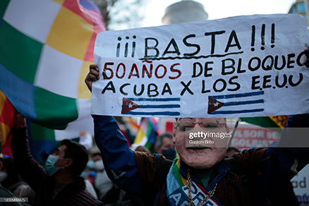 Supporters of Bolivian President Luis Arce, of the leftist Movimiento Al Socialismo (MAS) party, holds signs as they demonstrate outside the US embassy in La Paz on July 14, 2021, in support of the Cuban government and demanding the lifting of the economic measures imposed to the island. (Photo by AIZAR RALDES/AFP via Getty Images)A demonstrator wearing a costume of Bolivian President Luis Arce holds a sign in Spanish that reads ‘Stop! 50 years of blockades against Cuba by the United States’ during a demonstration and “Whipalazo” in support of the Cuban government on July 14, 2021 in La Paz, Bolivia. (Photo by Gaston Brito/Getty Images)Supporters of Bolivian President Luis Arce, of the leftist Movimiento Al Socialismo (MAS) party, demonstrate with Bolivian, Cuban and Wiphala -representing peoples of the Andes- flags, and a sign reading Enough! 50 years of US embargo to Cuba, outside the US embassy in La Paz on July 14, 2021, in support of the Cuban government and demanding the lifting of the economic measures imposed to the island. (Photo by AIZAR RALDES/AFP via Getty Images)