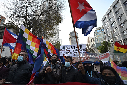 Supporters of Bolivian President Luis Arce, of the leftist Movimiento Al Socialismo (MAS) party, holds signs as they demonstrate outside the US embassy in La Paz on July 14, 2021, in support of the Cuban government and demanding the lifting of the economic measures imposed to the island. (Photo by AIZAR RALDES/AFP via Getty Images)