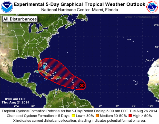 tropical-weather-update-august-20News Americas, MIAMI, FL, Fri. Aug. 22, 2014: A low pressure system outside the Caribbean Sea has a high chance of developing into a tropical depression in the next five days, forecasters at the National Hurricane Center said last night.