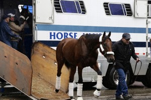 “He took him out to the three-eights, or the half mile pole and he was so strong when he got onto the track he was just marching right along. He was really full of himself so I called an audible on the radio with Jimmy (Barnes, assistant trainer) because he was pretty strong so we let him jog all the way around,” Baffert said of the dual Classic winner American Pharoah, who arrived on the grounds late Tuesday afternoon from Kentucky. “It was better off that way. Otherwise he would have wanted to gallop and get too tough down the stretch.”