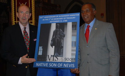Premier of Nevis Vance Winkworth Amory on Friday, Jan. 10th, unveiled a stamp paying tribute to former U.S. Secretary of the Treasury and son of Nevis, Alexander Hamilton. Amory unveiled the stamp at a church service to mark the 257th birthday of Hamilton at Trinity Church in New York City.