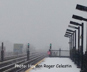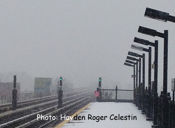 On the F subway line, at the Ave P subway station, in Brooklyn, New York, visibility was very bad due to the snow storm. Normally on a good weather day, the skyline of Manhattan is a welcome site.