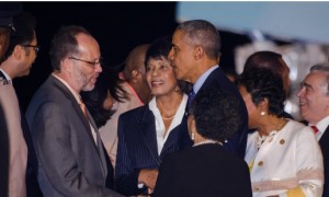 The President is being accompanied on the short trip to Jamaica by Jamaican-American Congresswoman Yvette D. Clarke. They were greeted on arrival by Governor General of Jamaica, Sir Patrick Allen and Prime Minister Portia Simpson Miller along with CARICOM Chairman and Bahamian Prime Minister, Perry Christie; CARICOM Secretary General, Ambassador Irwin LaRocque; Jamaica’s Foreign Affairs and Foreign Trade Minister, Senator AJ Nicholson; Opposition Leader, Andrew Holness; Speaker of the House of Representatives, Micheal Peart; President of the Senate, Senator Floyd Morris; Chief of Defence Staff, Major General Antony Anderson; Commissioner of Police, Dr. Carl Williams; Chief Justice, Zaila McCalla; Jamaica’s Ambassador to the United States, Professor Stephen Vasciannie and Chief of State Protocol, Elinor Felix.