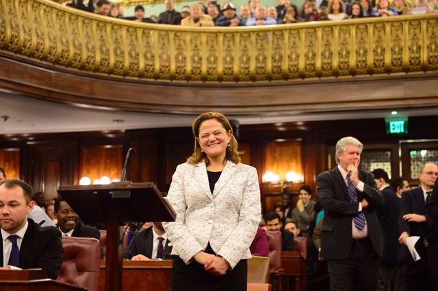 She was selected as the new Speaker on Jan. 8, 2014 after challenger, Dan Garodnick, withdrew his candidacy shortly after 1 p.m. Wednesday. Garodnick had pressed his candidacy even after Mark-Viverito declared she had majority support last month, and the Bronx and Queens Democratic chairs, with 20 Council members on their side, resisted de Blasio’s pressure to get on board with Mark-Viverito. Garodnick had received support from councilmembers aligned with the Queens Democratic organization.