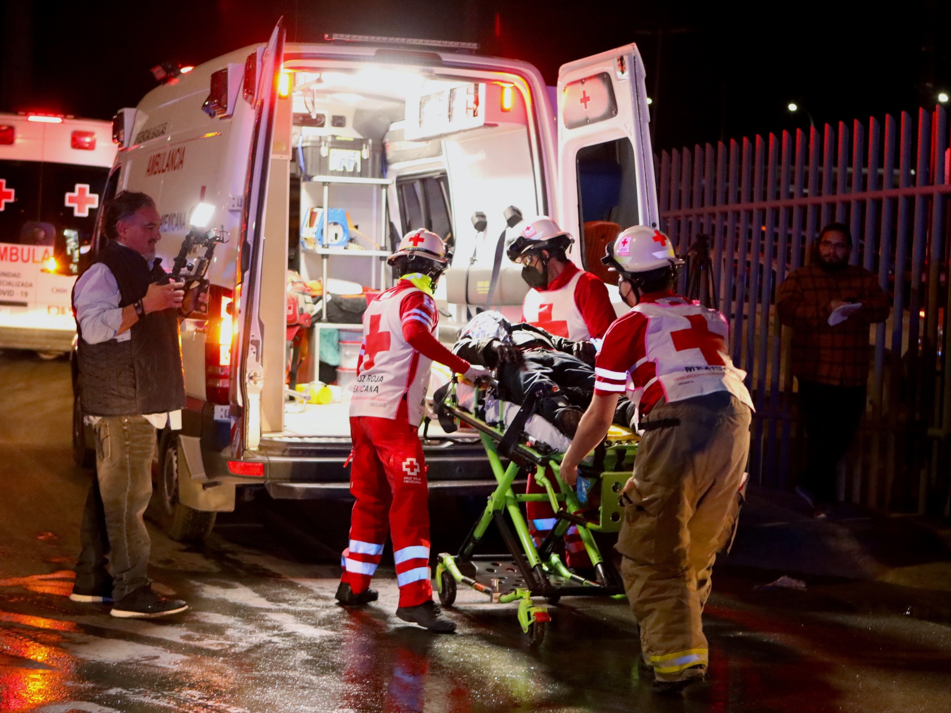 Mexican authorities and firefighters remove injured people, mostly Venezuelans, from inside the National Migration Institute building [Jose Luis Gonzalez/Reuters]
