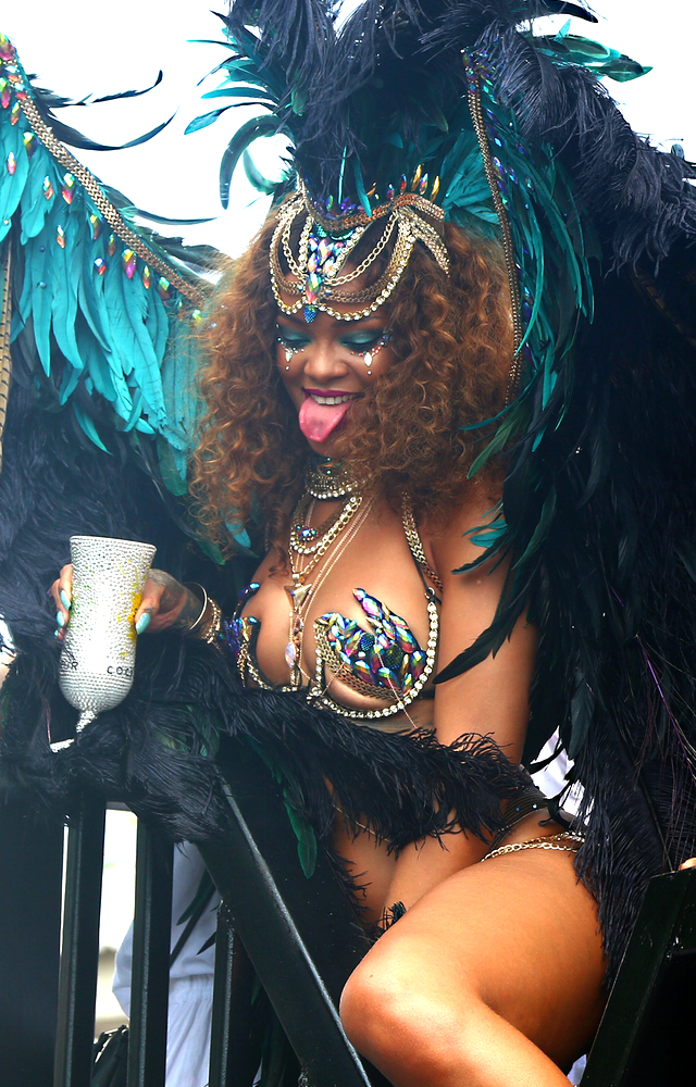 For this year’s carnival, Rihanna wore a barely-there Zula costume with a barely there diamond sparkly bra, matching underwear and a huge feathered green and black head-dress and wings.