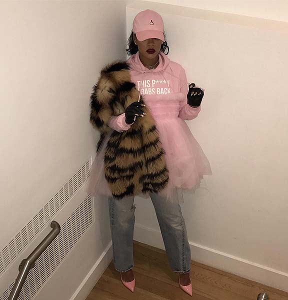 Rihanna sported a pink hat with tulle bottom hoodie top paired with jeans and a tiger striped stole that read: “This P***y Grabs Back.”
