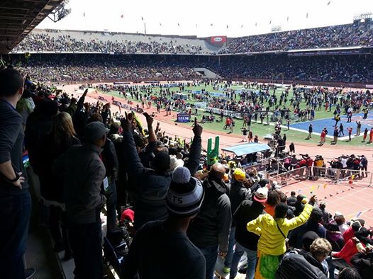 Before and during the race, loud cheers of the 49,103 spectators rattled around the stadium as people raised and waved flags of all sizes, blew discordant vuvuzelas, tooted horns, clanged cowbells and shouted at the top of their voices in an attempt to propel their teams to victory.