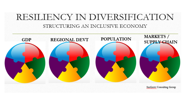 While low hanging profitable sectors may attract more support leading to faster short-term growth, overdependence creates environments with weaknesses of single points of failure within the normal cycle of economic ups and downs. Investing in building complementary sectors, thus balancing the ratio of sector participation, adds resiliency which can better withstand inevitable downtowns, natural or human caused.