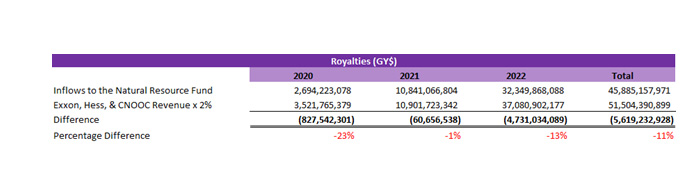 News Americas, NEW YORK, NY, Sat. Feb. 24, 2024: Analysts attempted to reconcile the 2020-2022 Guyana Natural Resource Fund royalties’ balance. To their dismay, there is a significant shortage of royalty payments in the years 2020 and 2022, 23% and 13% respectively. The Natural Resource Fund appears to be missing an approximate GY$5.6B (US$27M) in royalties, payments that Exxon and its affiliates should have made.