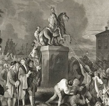 My special wedding gift to them is this week’s graphic. One of Harry’s well-known ancestors – Great Grandpa George – being ripped apart right here at Bowling Green, NY. They should come fora Royal Visit!