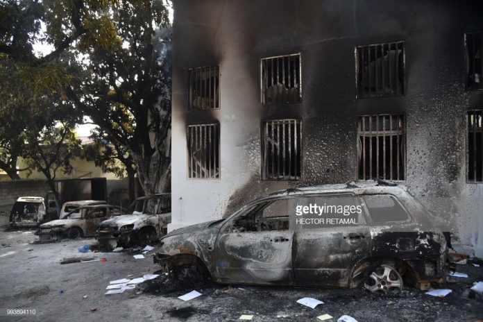 Haiti Prime Minister Jack Guy Lafontant called for Haitians to stop burning tires and blocking roads as he temporarily suspended the price increase on Saturday. But the protests continued Sunday as looters pillaged burned and vandalized shops in Haiti’s capital. Cars were bured during looting at a telephone company are seen in the commune of Petion Ville in Port-au-Prince. Shops were ramsacked while groups began erecting new road barricades on the capital’s outskirts.
