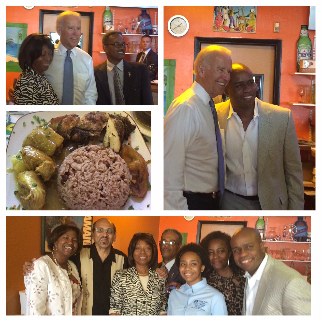 VP Biden headed out to a shopping mall in west Kendall in Miami to the Island Restaurant, a Jamaican café, where he enjoyed a sampling plate of curry chicken, jerk chicken, rice and peas, steamed veggies and ripe plantains.