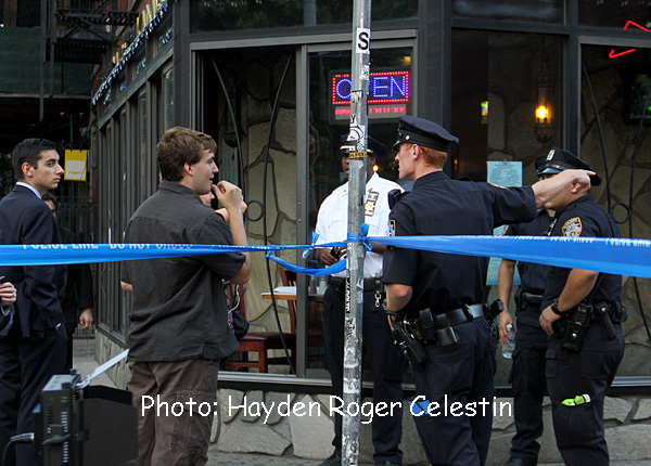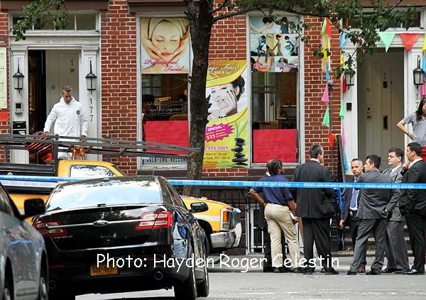 News Americas, NEW YORK, NY, Tues. July 29, 2014: A New York City Police Department Crime Scene Detective late Monday walked through a doorway where two Marshals and a NYPD Detective were shot by a suspect they were trying to arrest in New York City’s, West Village on Monday July 28, 2014.